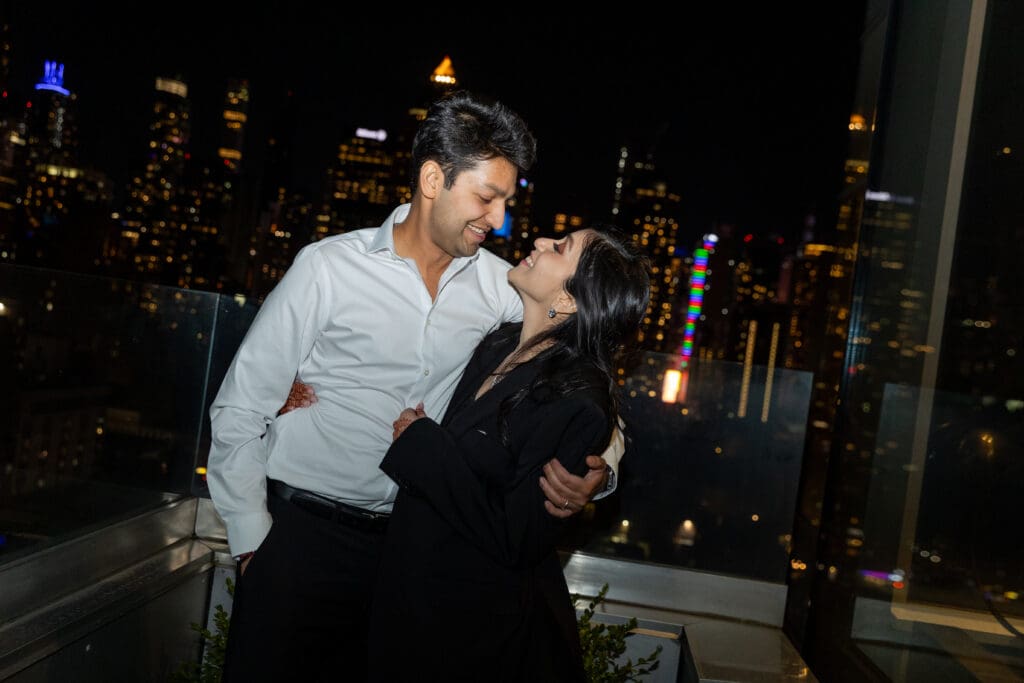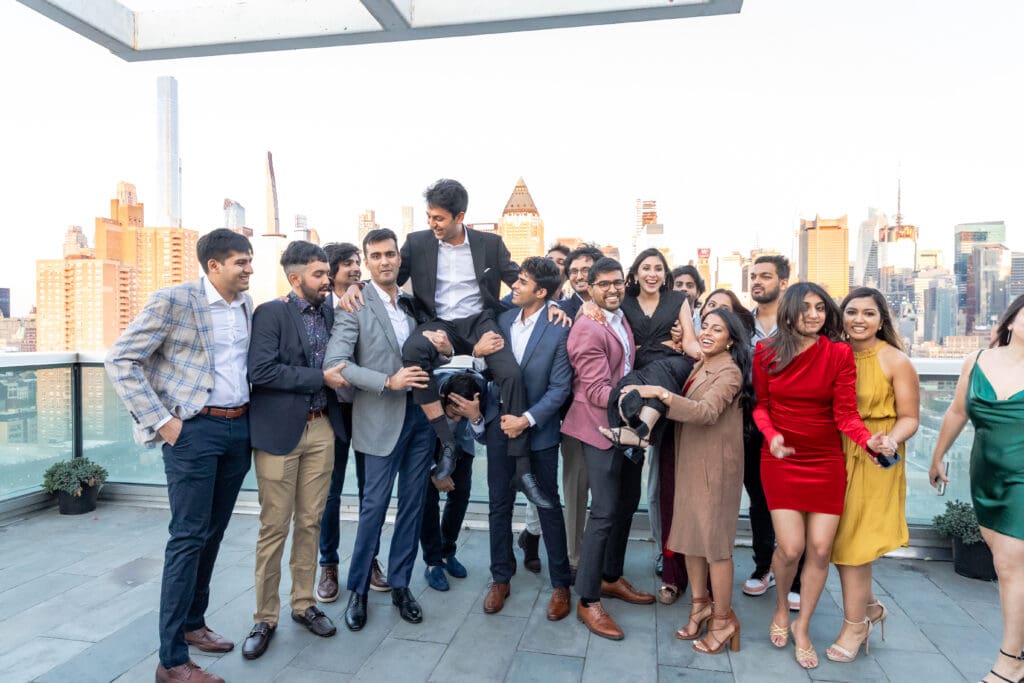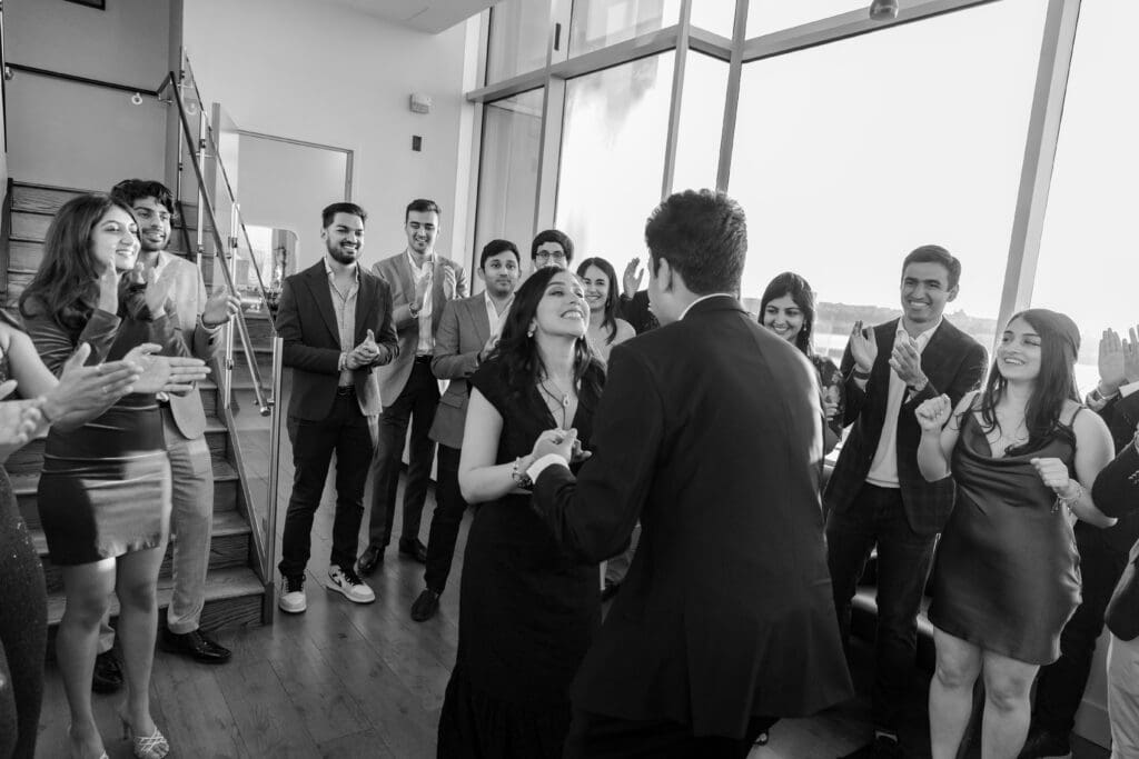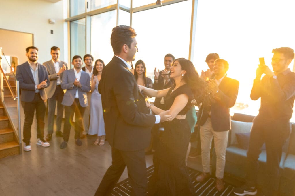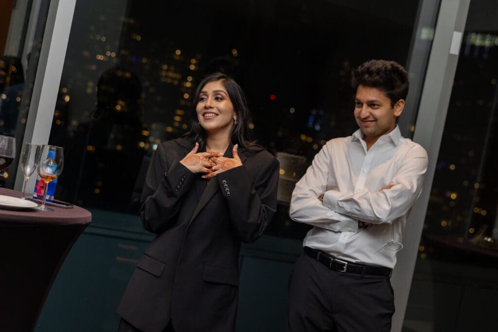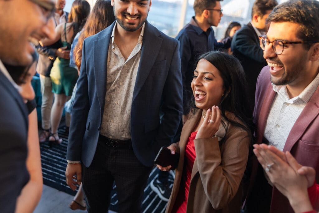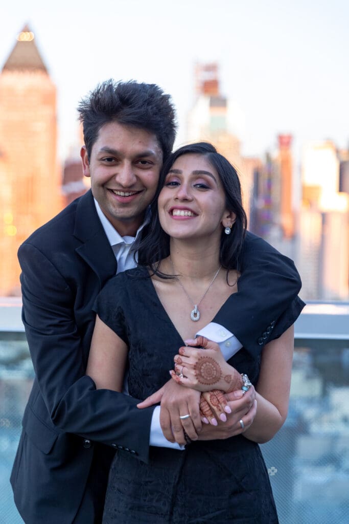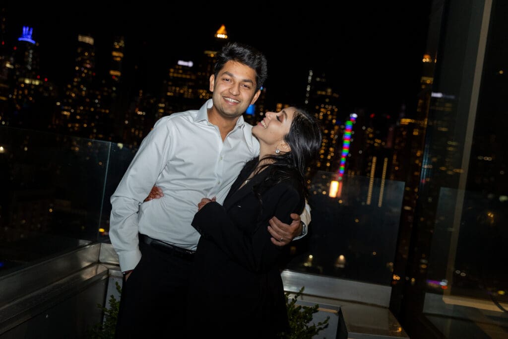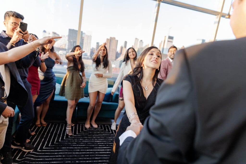 After their proposal, Karan surprised Shreya with a Manhattan rooftop engagement party in NYC with all of their friends, including a choreographed Bollywood dance.