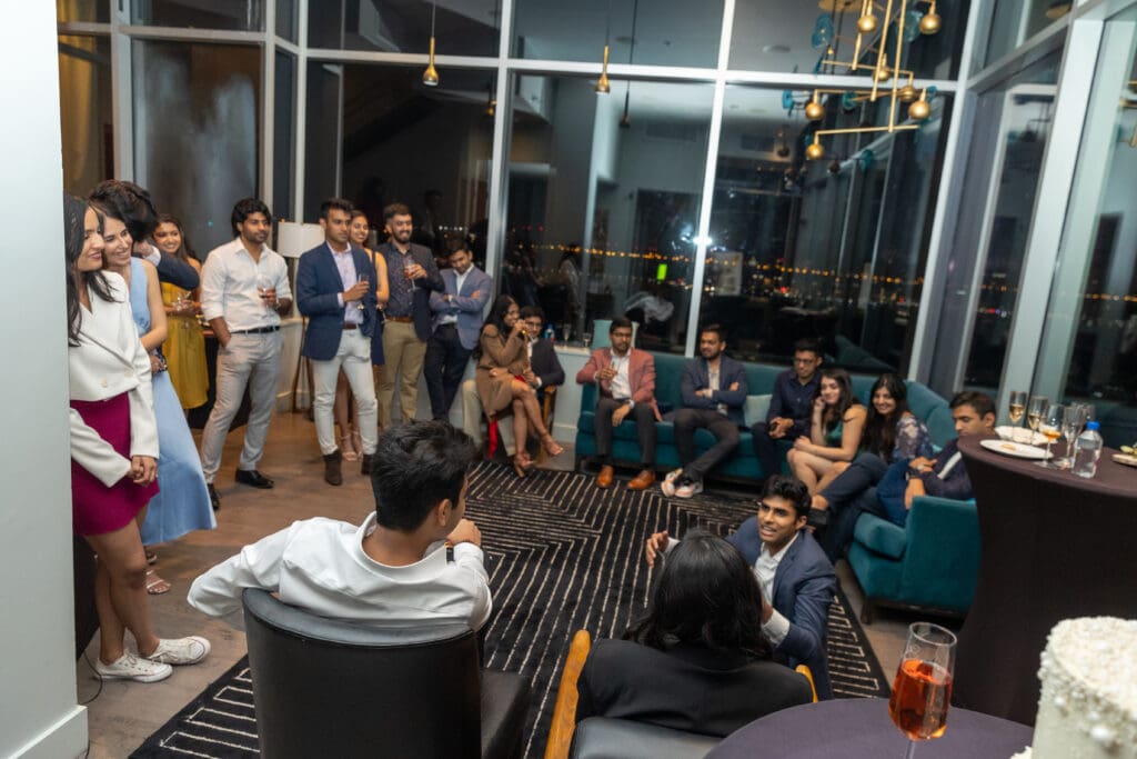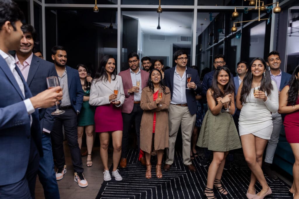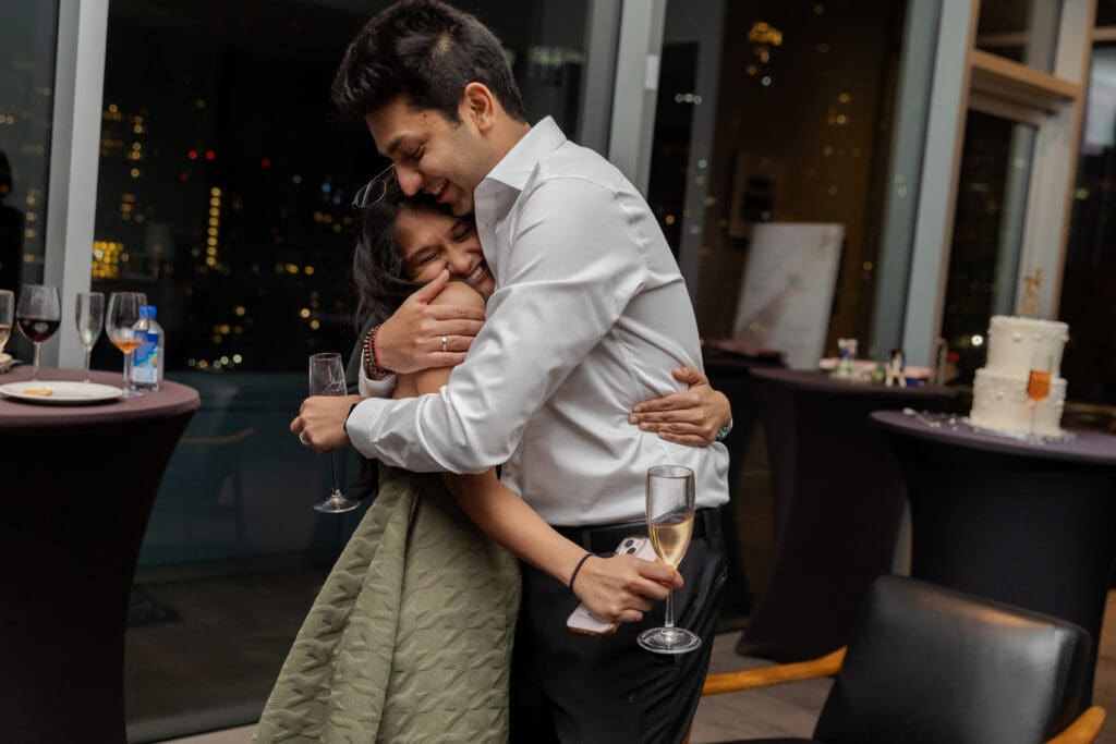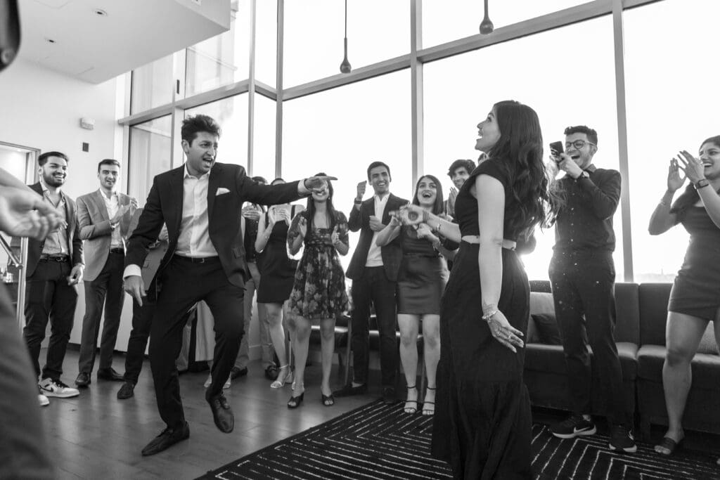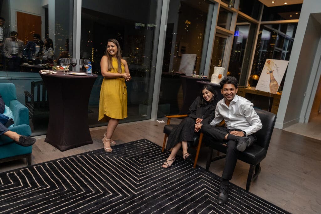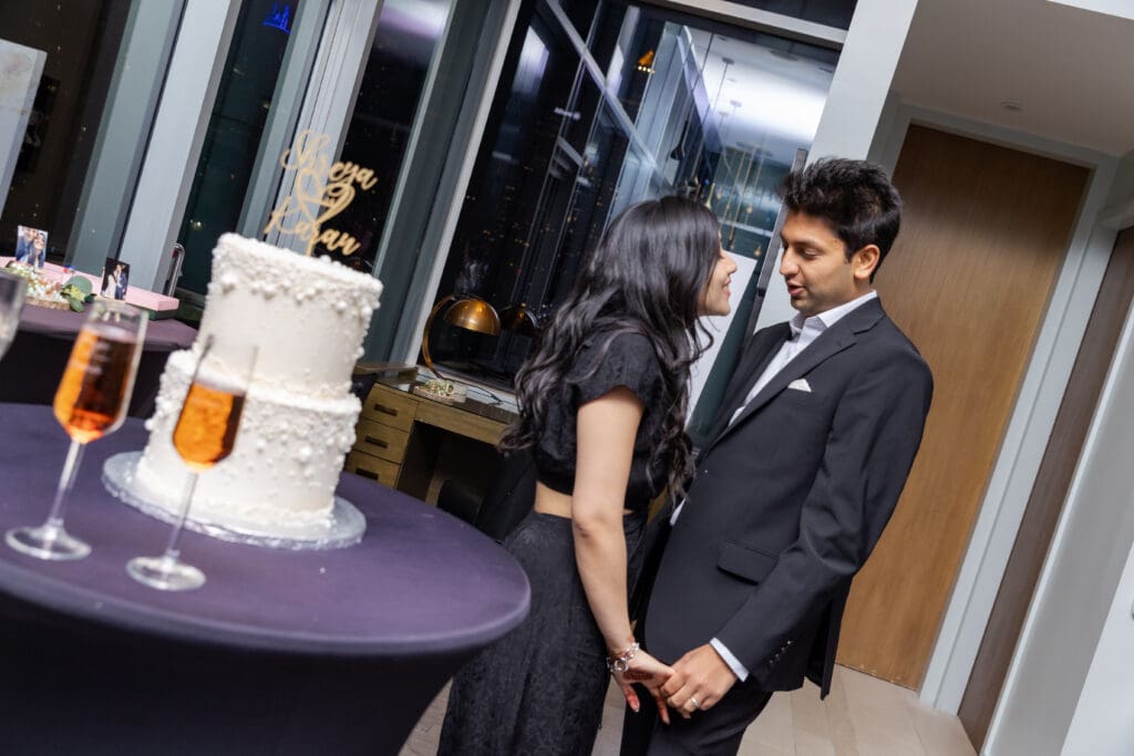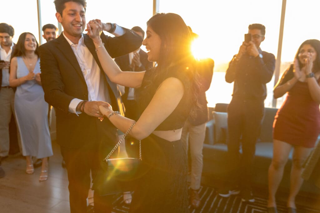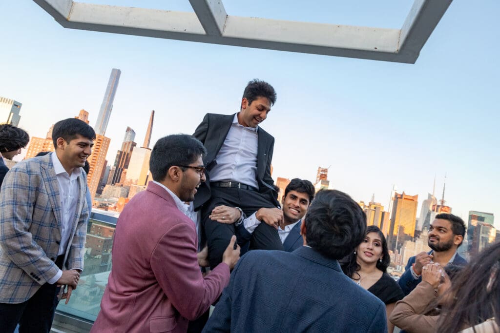 After their proposal, Karan surprised Shreya with a Manhattan rooftop engagement party in NYC with all of their friends, including a choreographed Bollywood dance.