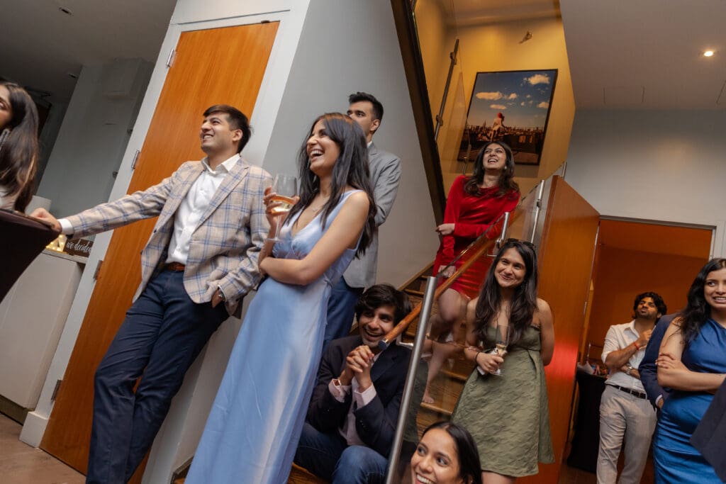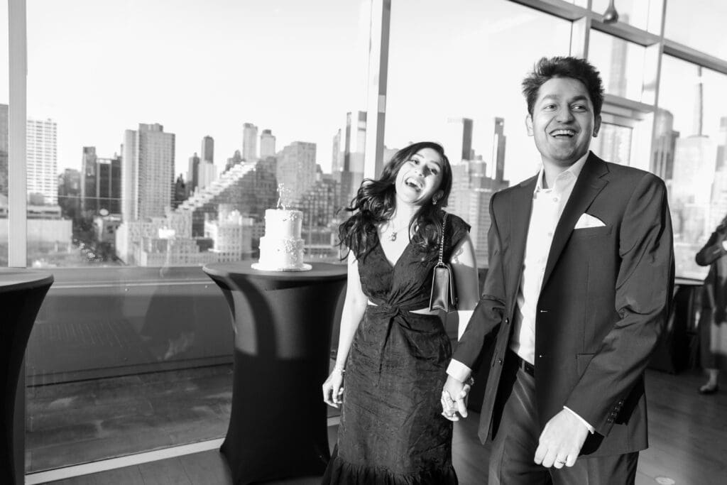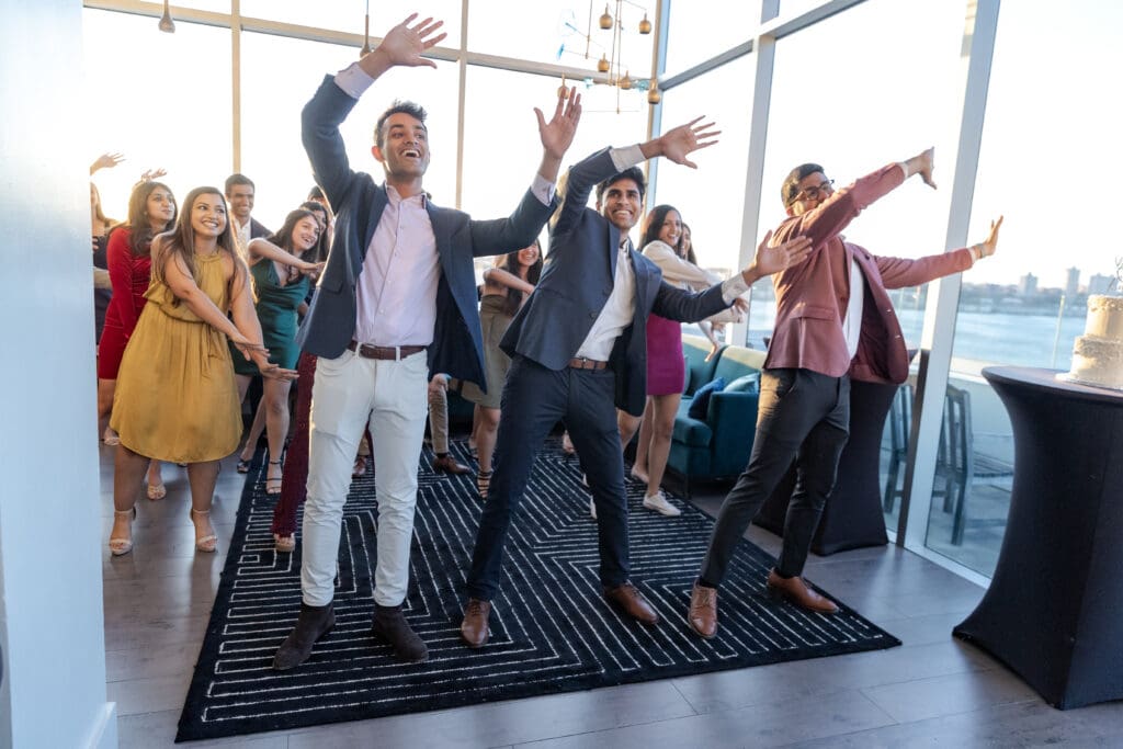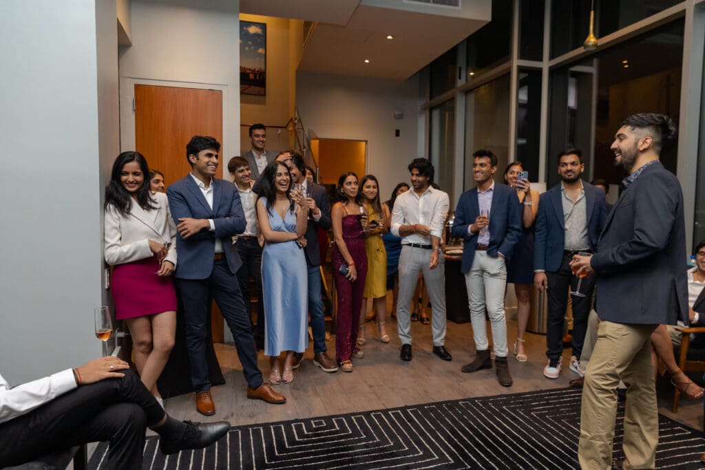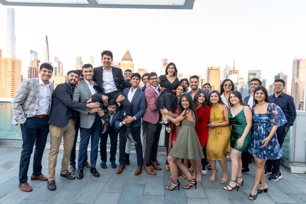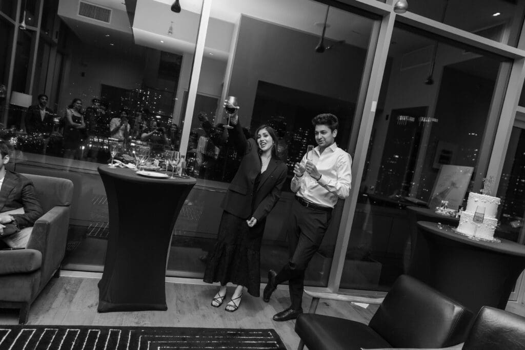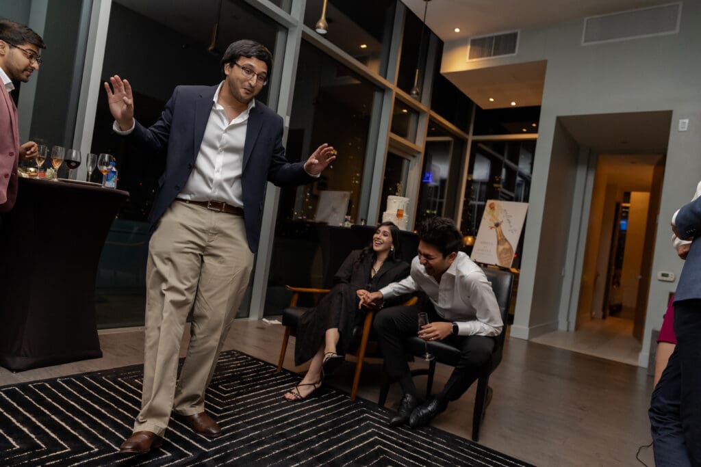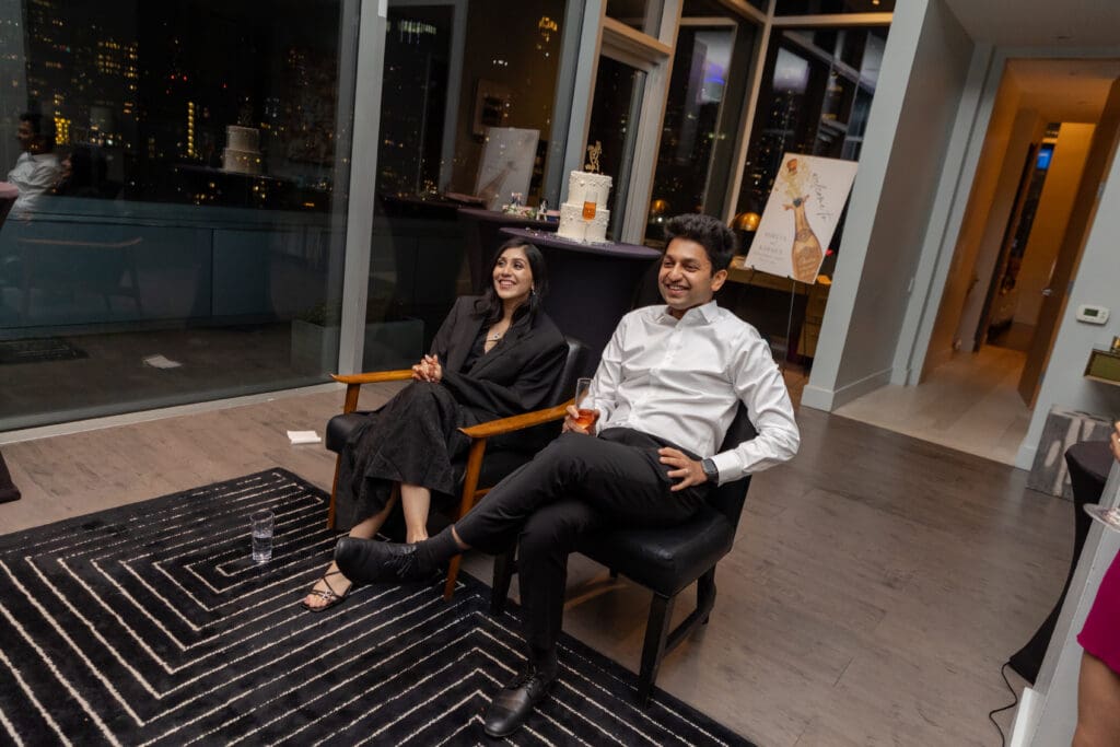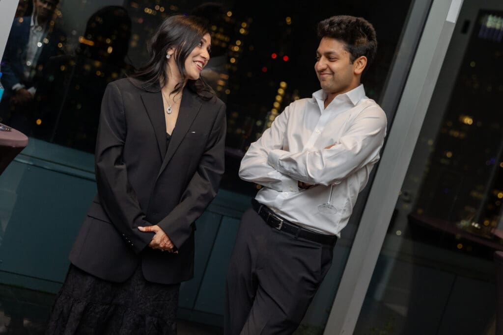 After their proposal, Karan surprised Shreya with a Manhattan rooftop engagement party in NYC with all of their friends, including a choreographed Bollywood dance.