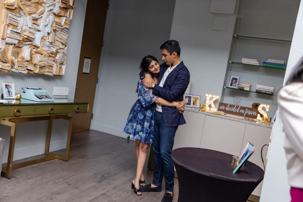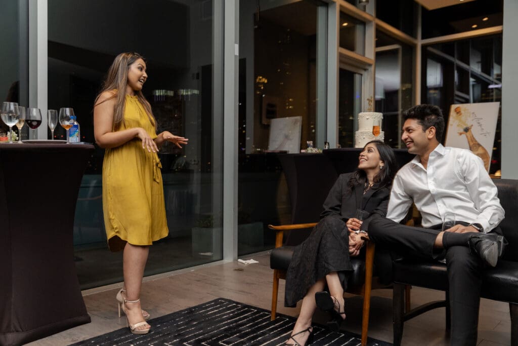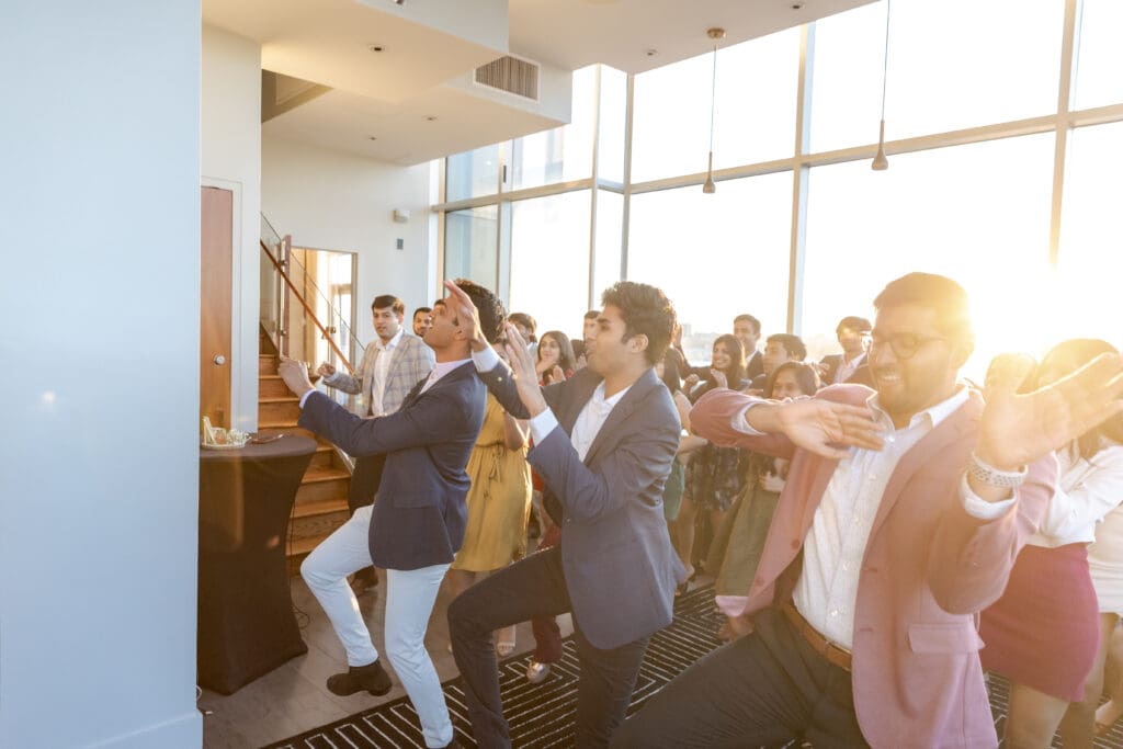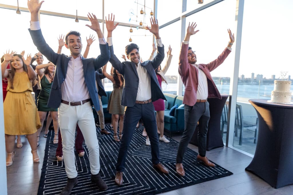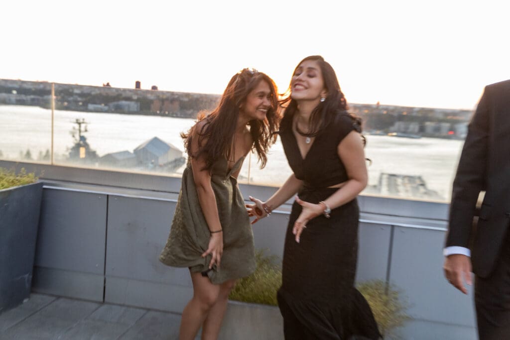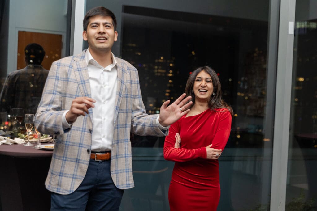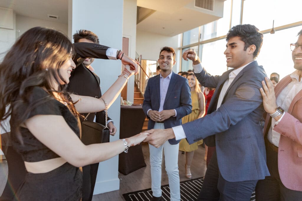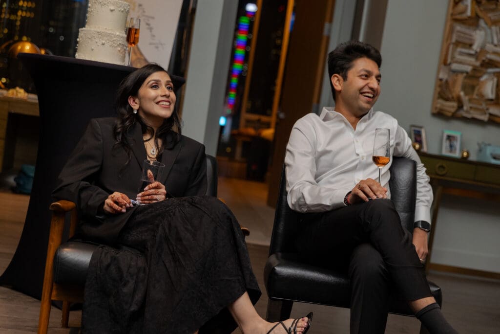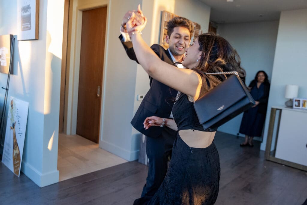After their proposal, Karan surprised Shreya with a Manhattan rooftop engagement party in NYC with all of their friends, including a choreographed Bollywood dance.