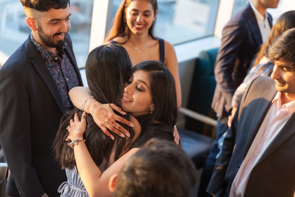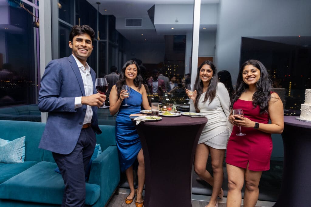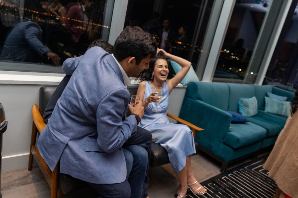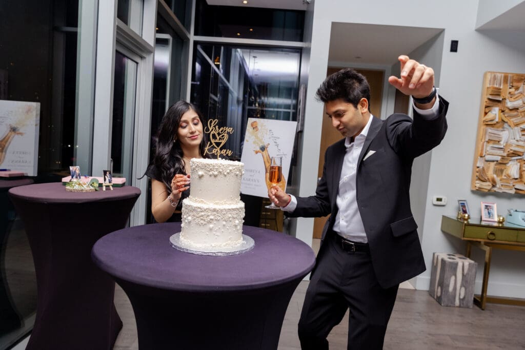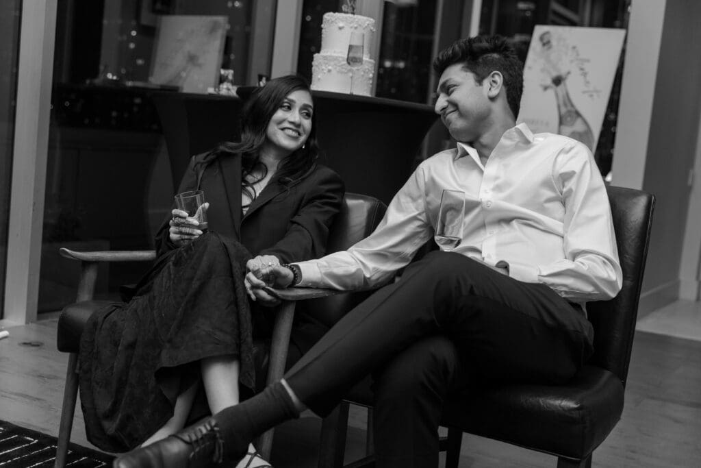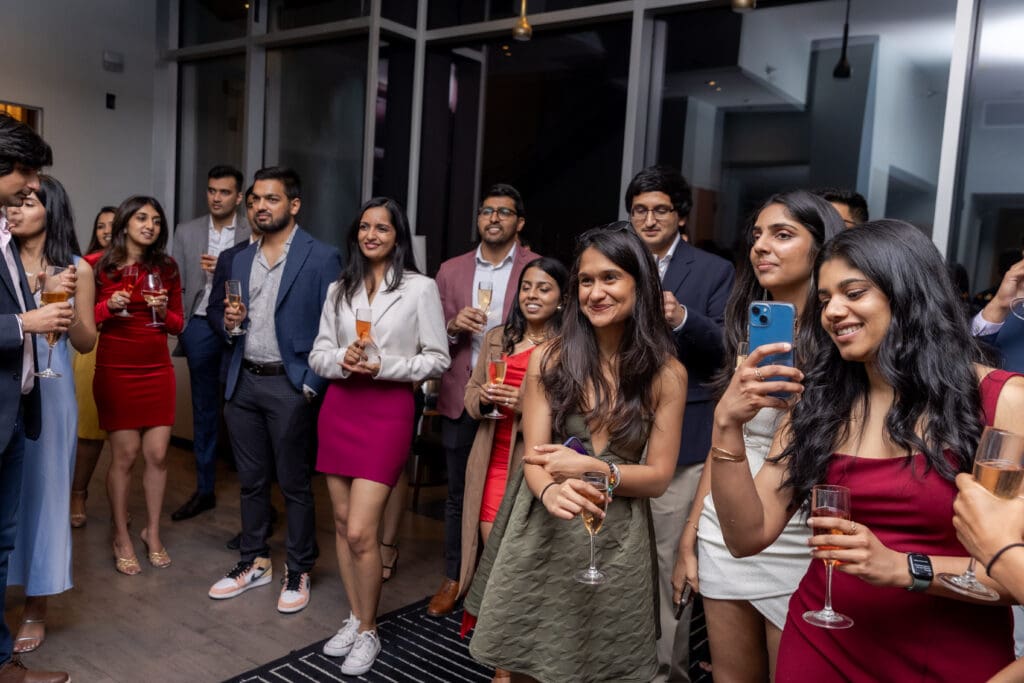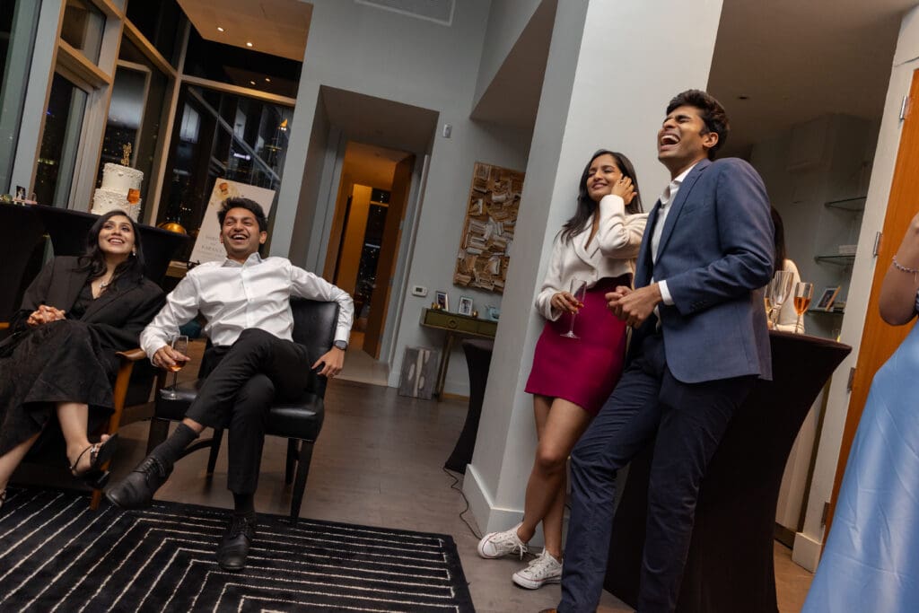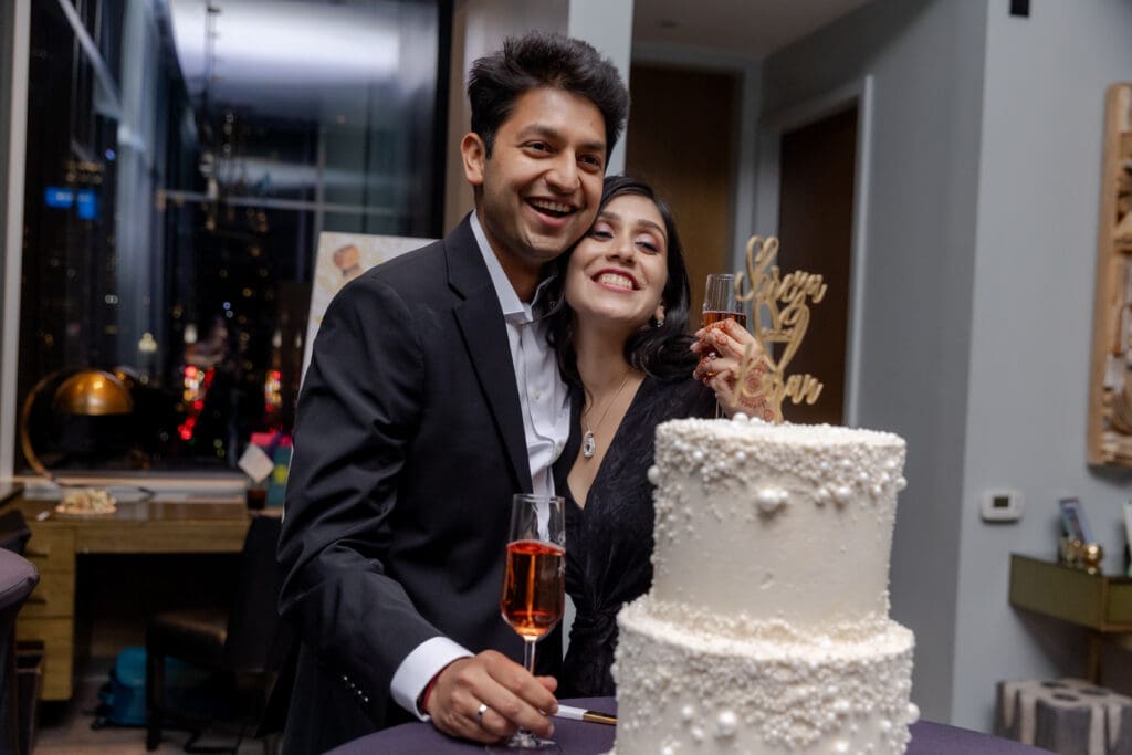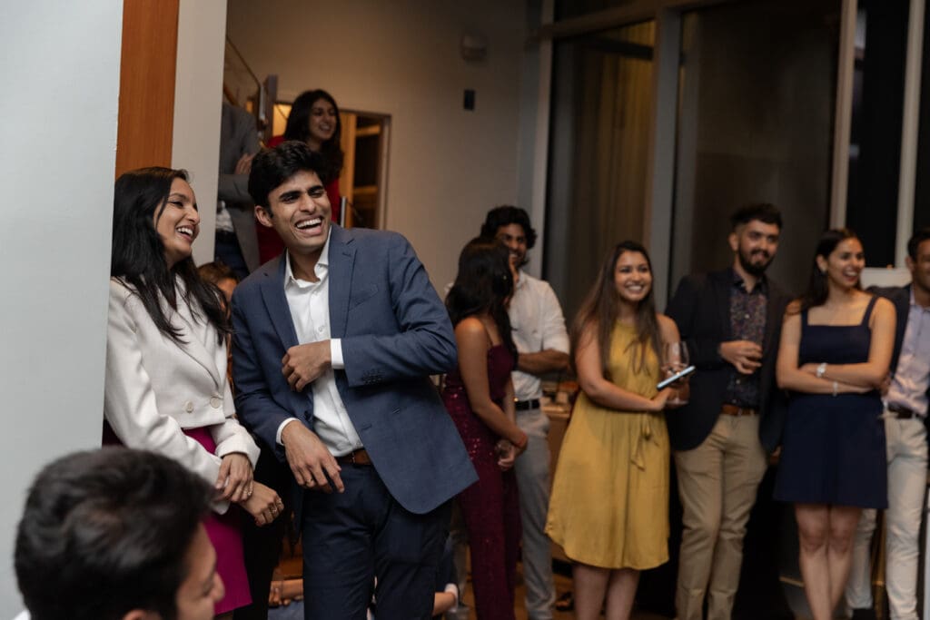 After their proposal, Karan surprised Shreya with a Manhattan rooftop engagement party in NYC with all of their friends, including a choreographed Bollywood dance.