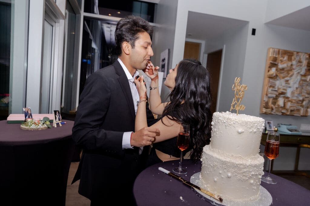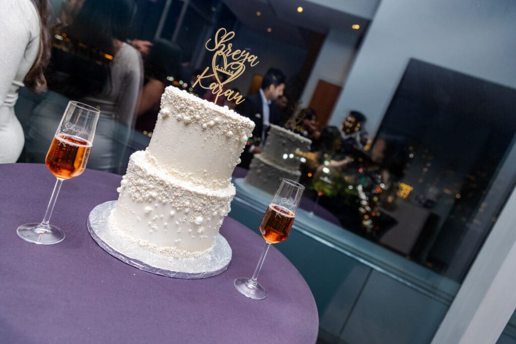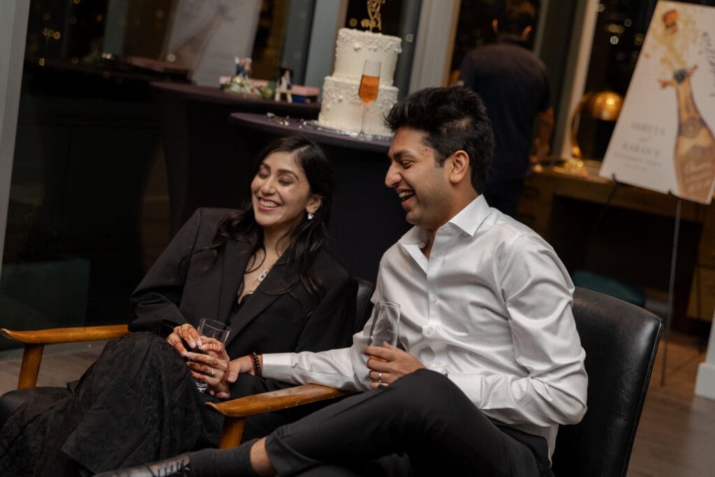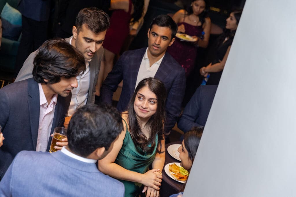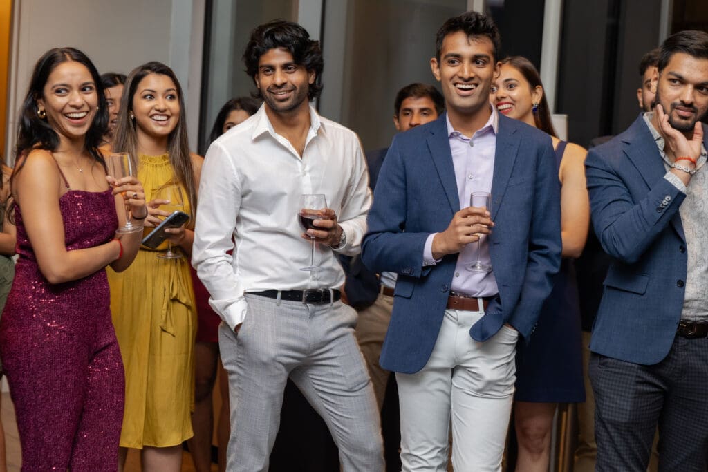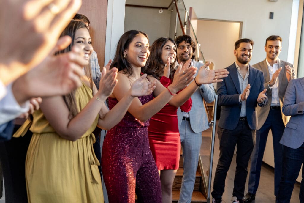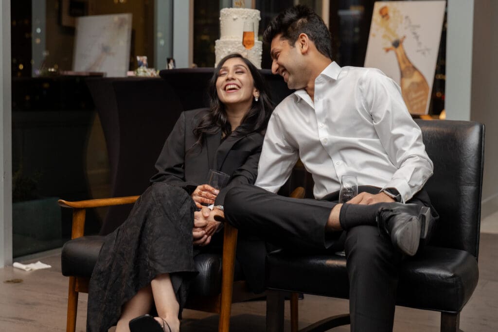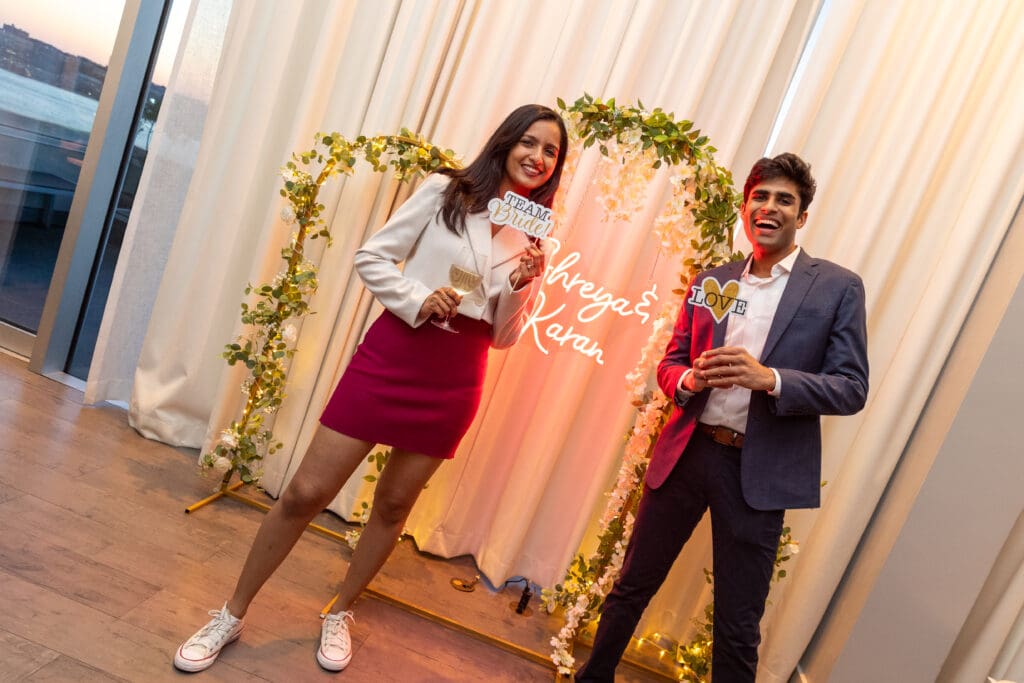 After their proposal, Karan surprised Shreya with a Manhattan rooftop engagement party in NYC with all of their friends, including a choreographed Bollywood dance.