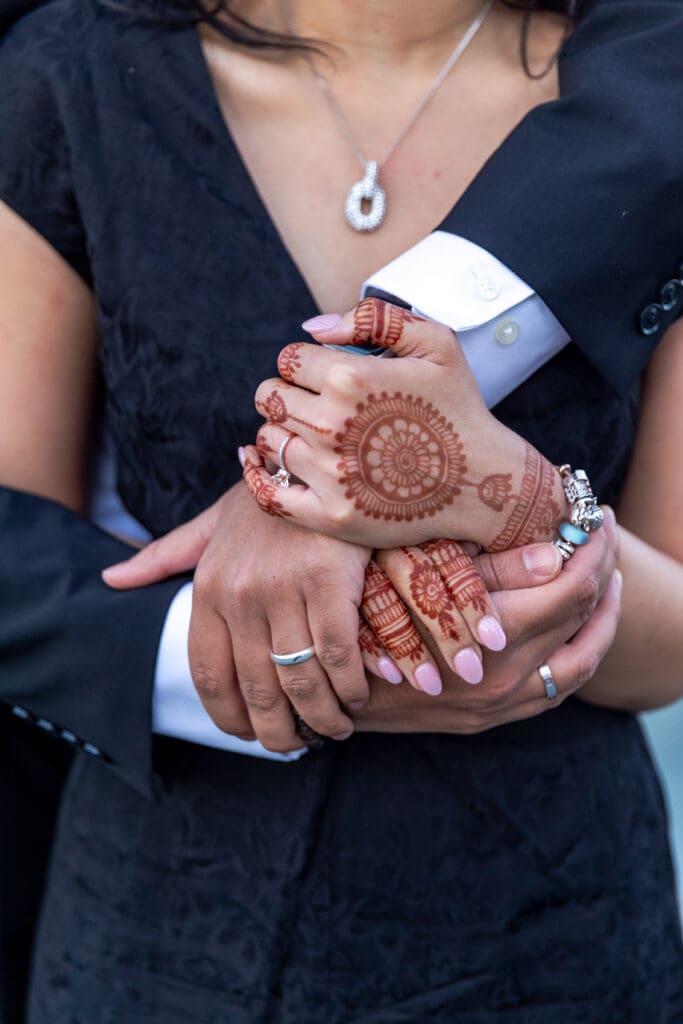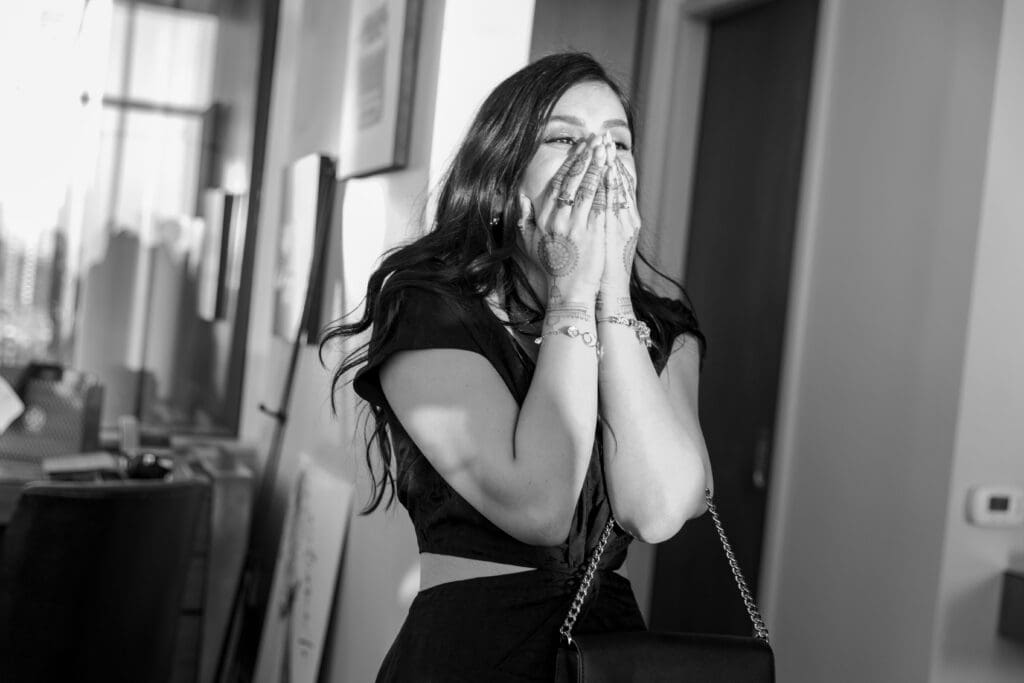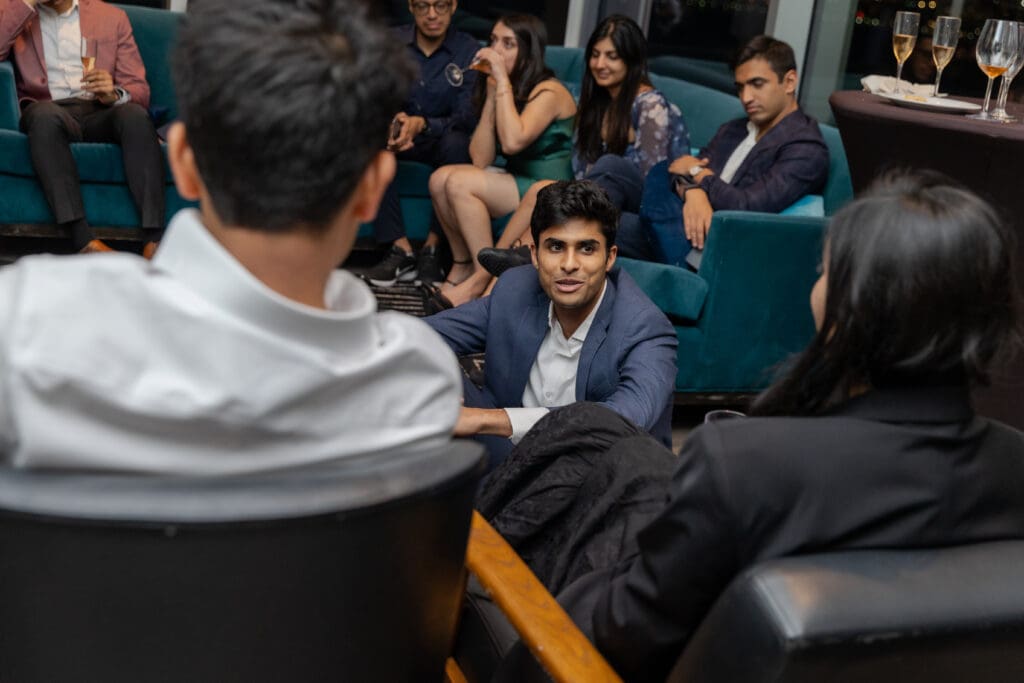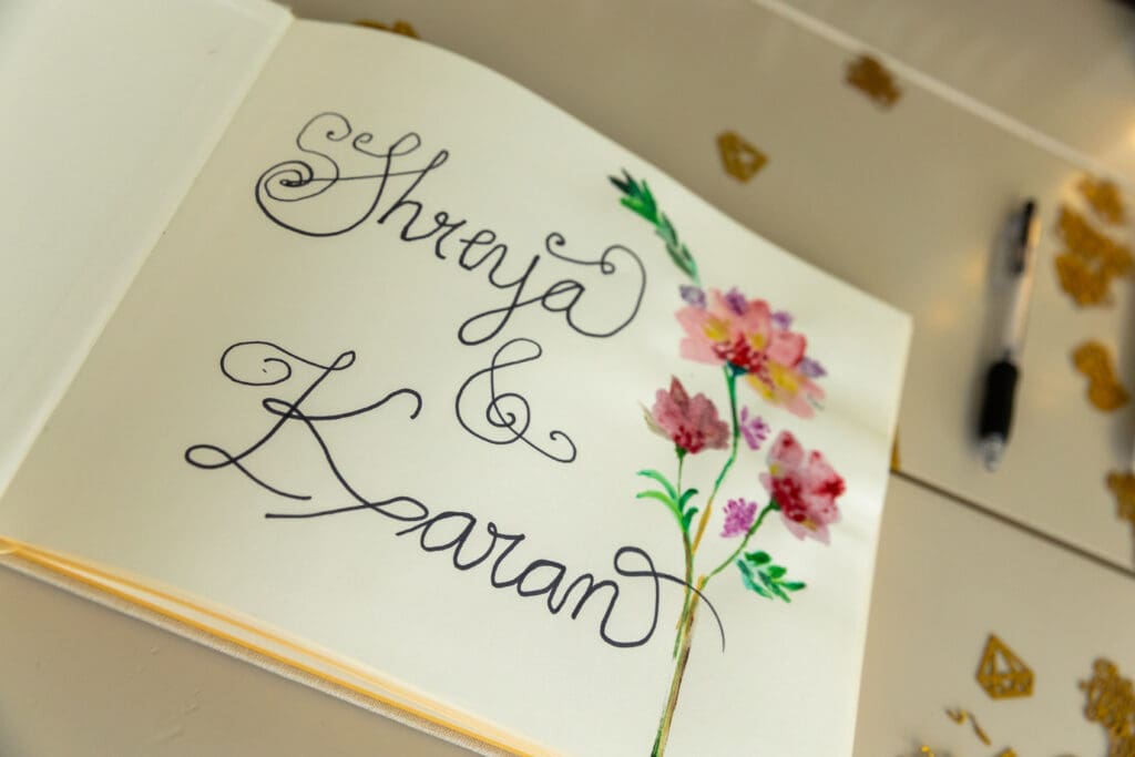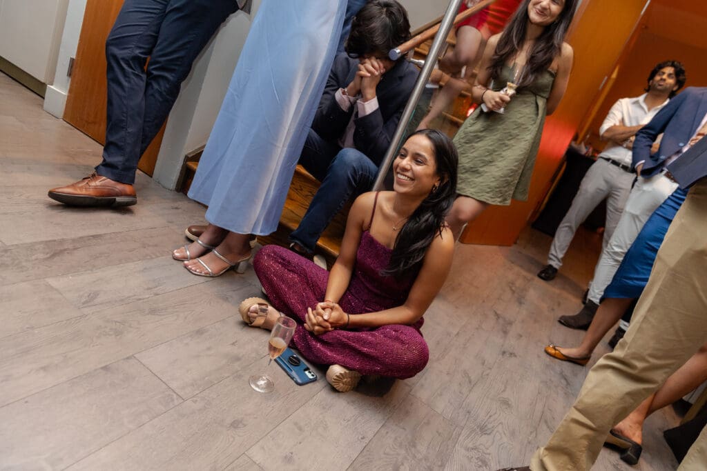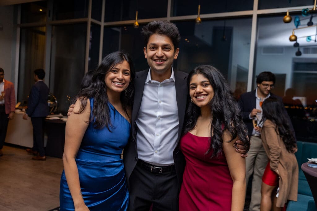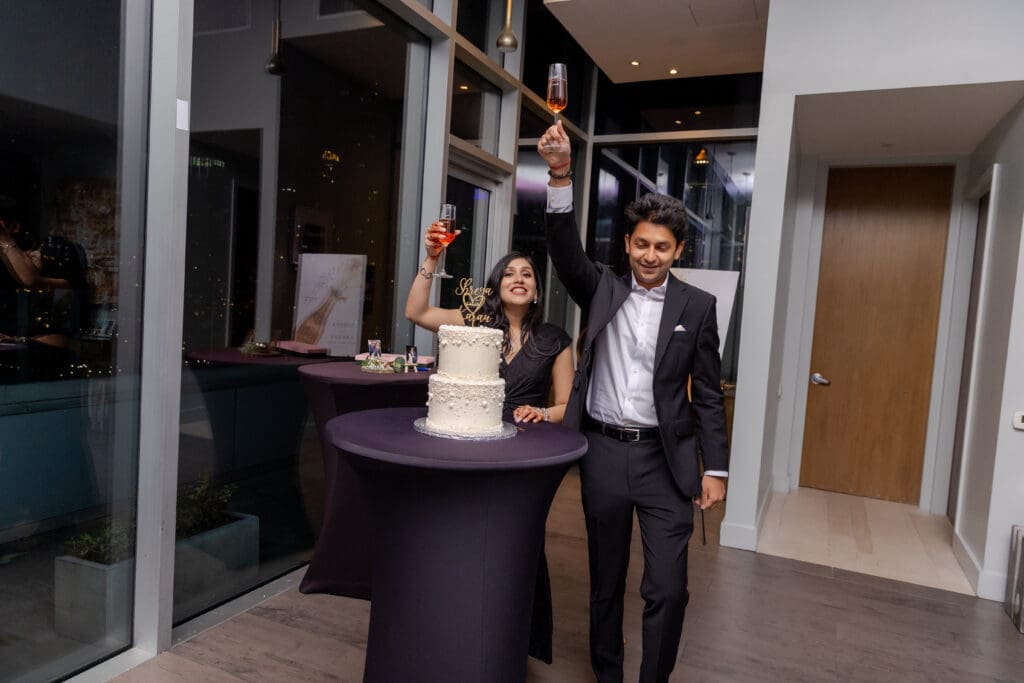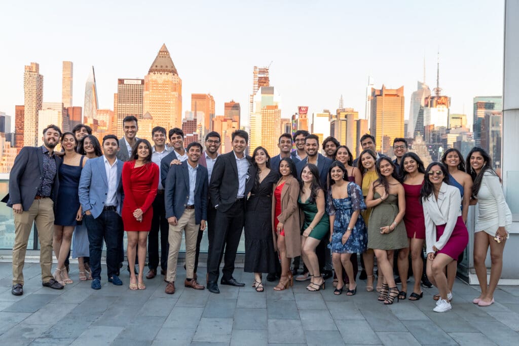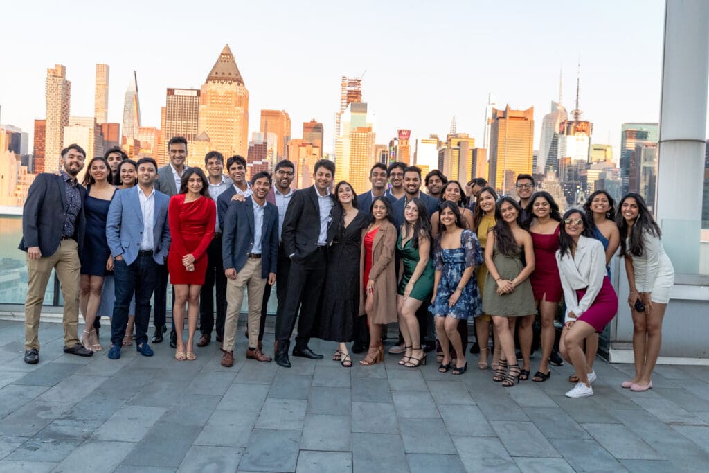 After their proposal, Karan surprised Shreya with a Manhattan rooftop engagement party in NYC with all of their friends, including a choreographed Bollywood dance.